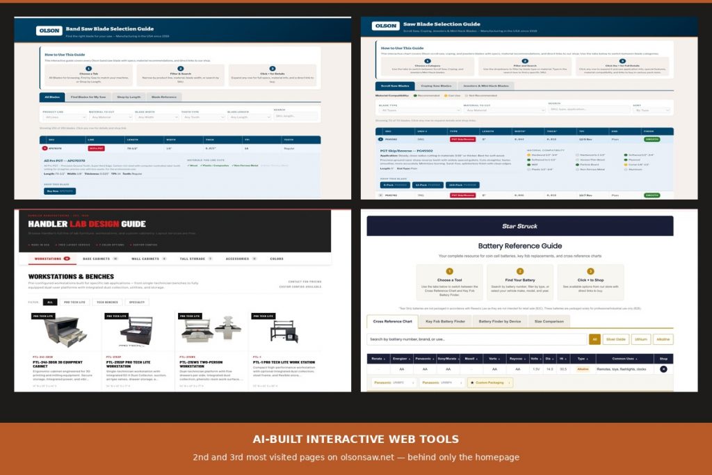 The Approach: Using AI-assisted development, I directed the build of a suite of interactive web tools across four brands — providing all technical specifications, defining the UX structure and filtering logic, and managing implementation on each site. Every tool was built to match brand standards and integrate seamlessly with existing WordPress sites. The Olson Band Saw and Scroll Saw guides became the second and third most visited pages on olsonsaw.net, behind only the homepage.